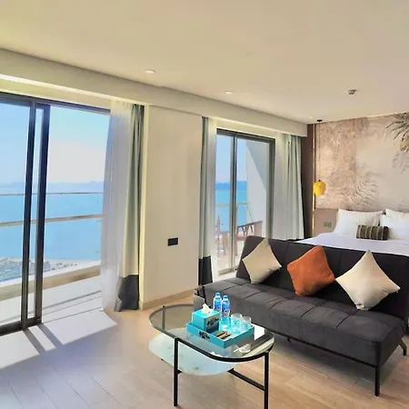 Luxury Beachfront Apartment With Ha Long Bay View includes a balcony, a living room, and a well-equipped kitchen with air conditioning for utmost comfort. A highlight of this accommodation for guests is the presence of a hair dryer in the bathroom.